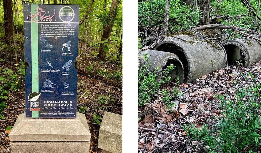 An Indy Bird sign, which was riddled with bullet holes, and the two graffiti-laden Greenway signs were removed and discarded during the 2023 spring cleanup.